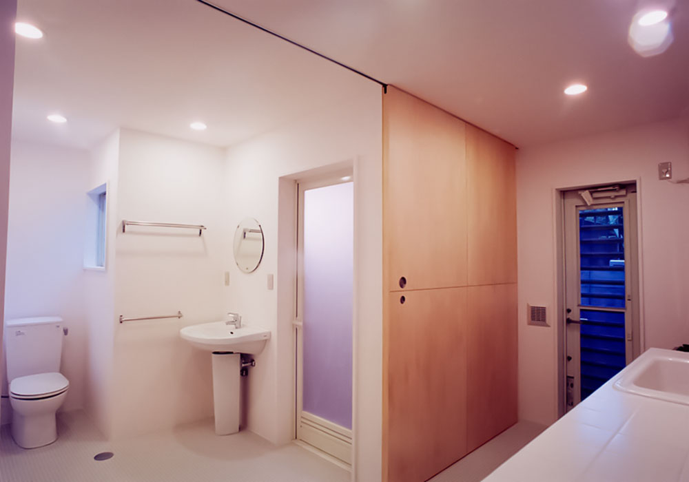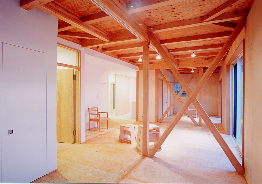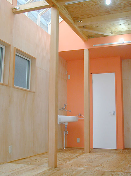 完全に分離した2世帯住宅に7人が同居し、且つアトリエ併用。 という条件のもと坪単価50万円以下のローコストでの完成を実現した。