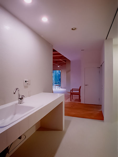 洗面とキッチンは奥の大きな木の壁がスライドして 間仕切ることが出来る